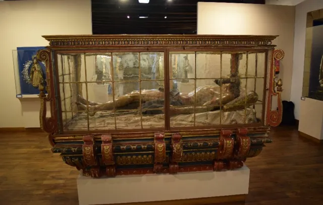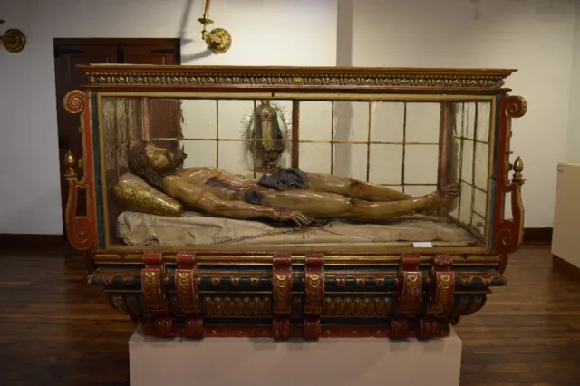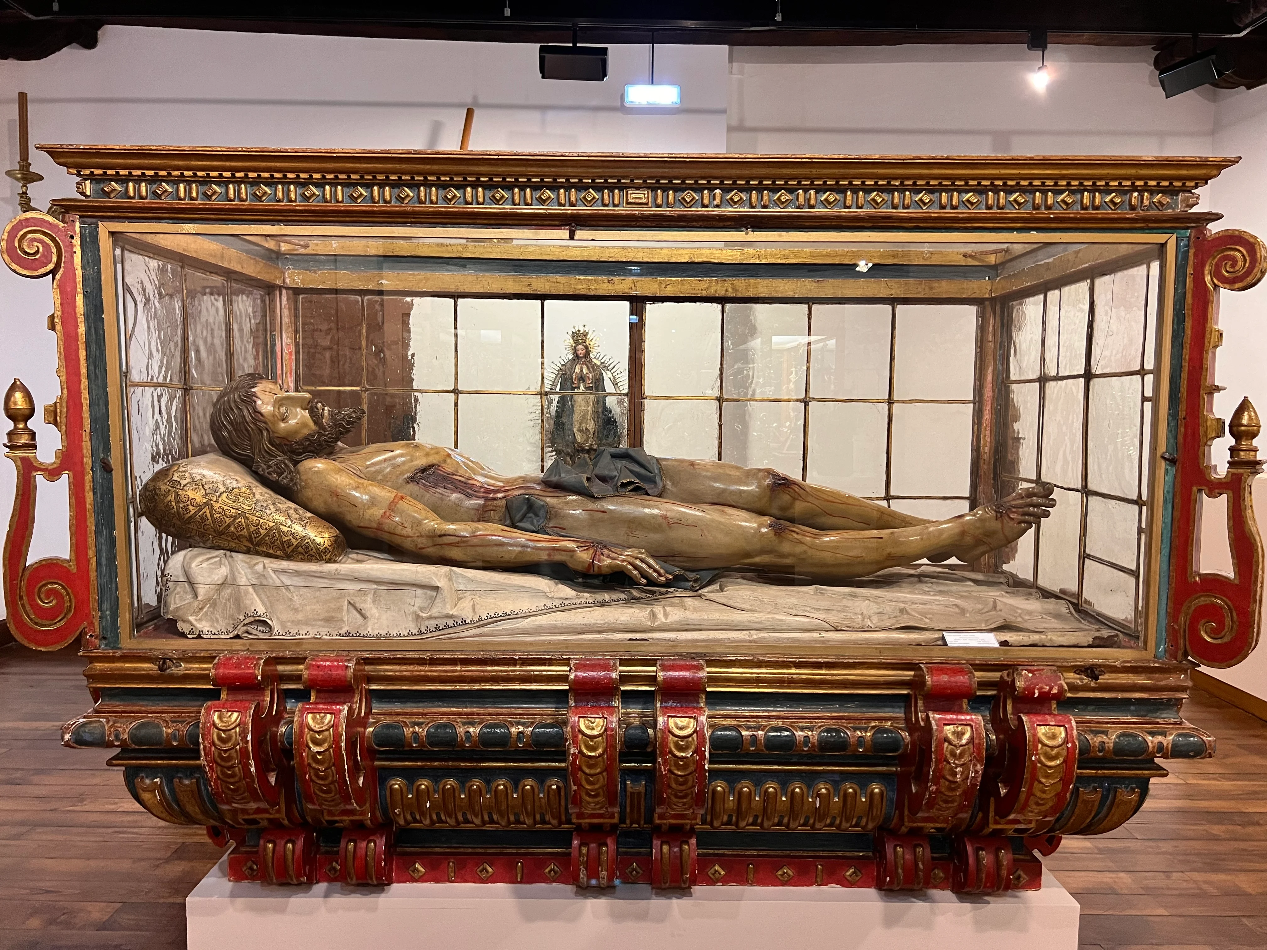 Esta imagen escultórica representa a Cristo en posición yacente, inmediatamente después de la Crucifixión. Realizada en madera policromada, la obra destaca por su realismo y detallismo, fruto de un cuidadoso estudio anatómico y de una técnica escultórica refinada. El cuerpo, tallado como pieza exenta, está concebido para ser contemplado desde todos los ángulos, lo que permite apreciar la complejidad y expresividad de la figura.