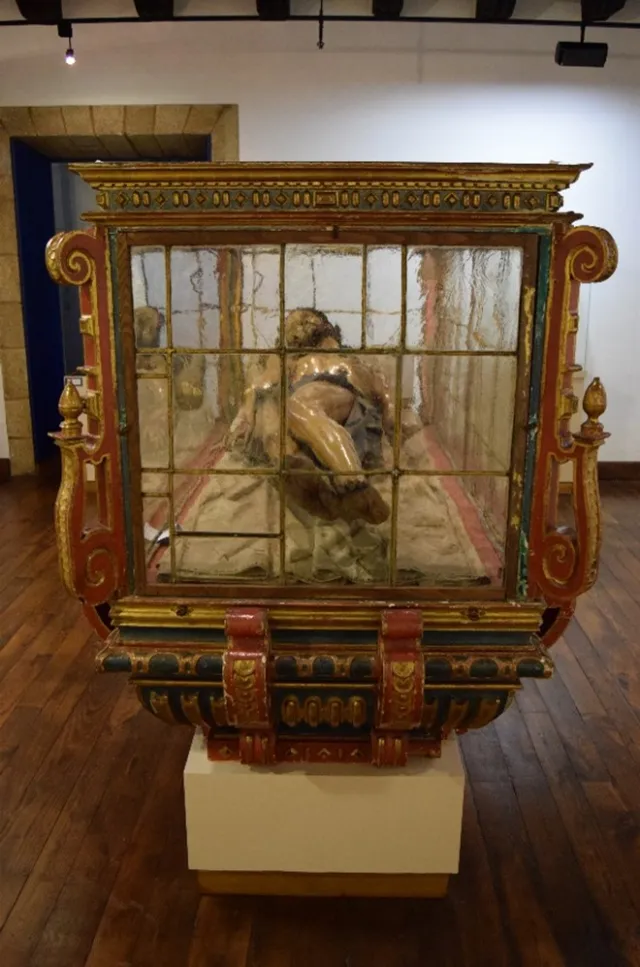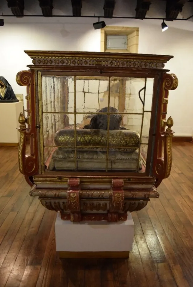 La obra reposa sobre una almohada y un colchón, también tallados en madera policromada, que alcanzan un notable efecto táctil y de suavidad. El conjunto se completa con una urna procesional de madera y cristal, en la que se custodia actualmente la escultura.