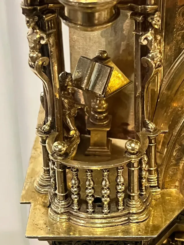 En la parte superior, un friso con una larga placa de esmalte da paso al frontón de remate, que contiene en su centro un medallón con una paloma, símbolo del Espíritu Santo. En cada vértice del triángulo, tres figuras: dos femeninas a los lados, símbolo de la antigua y la nueva Lei, y una central, la cual representa a Cristo bendiciendo entre dos finas volutas.