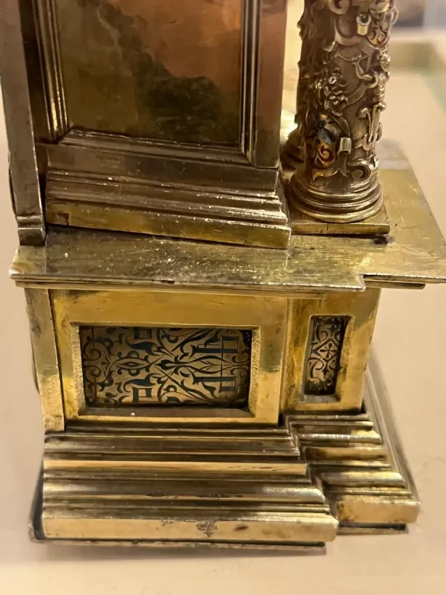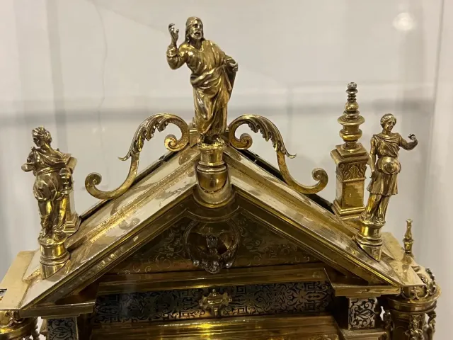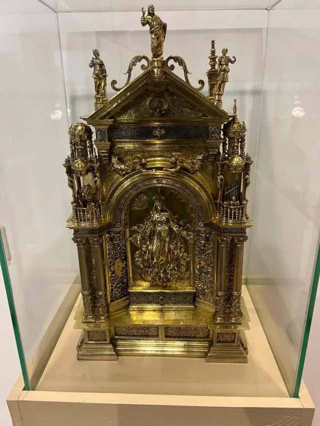 Portapaz de estética manierista realizado en plata sobredorada decorado con diversas placas de esmalte. La pieza sigue una disposición similar a la de un pequeño retablo, dividiendo su cuerpo central en tres naves, siendo la central más ancha que las laterales. Así, sobre un banco con avances en los laterales y decorado con placas de esmalte, se desarrolla un espacio a modo de escena y protegido por el gran arco de medio punto de la parte superior, el cual sigue un esquema similar al de un arco de triunfo. En el centro, la placa de esmalte de la parte inferior actúa como elemento de transición hacia una elaborada representación de la Asunción. En ella, la Madre de Dios aparece envuelta en un ampuloso manto e impulsada por ángeles niño en marcado sentido ascensional. Asimismo, la figura demuestra un cuidadoso estudio anatómico del cuerpo femenino, que, sin embargo, presenta un canon ligeramente alargado de gusto miguelangelesco. Destaca el tratamiento de los ropajes, los cuales aparecen cuidadosamente representados mediante la técnica de paños mojados. Por lo demás, el fondo aparece ligeramente difuminado, lo que crea una sensación de profundidad, motivada por el uso del sfumato como recurso expresivo.