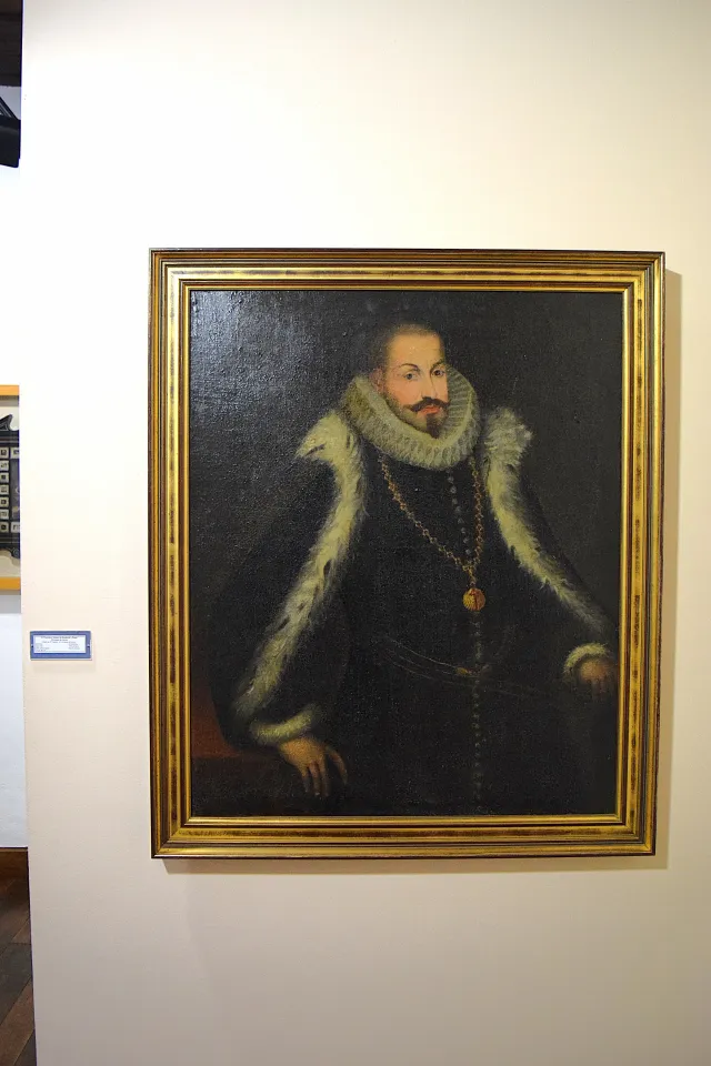 La indumentaria corresponde a la moda cortesana de la época, compuesta por un traje negro de corte austero y un manto amplio, ambos forrados de armiño, indicativo de la alta posición del retratado. Sobre el pecho destaca una cadena de oro con un medallón en forma de venera que incorpora la Cruz de Santiago, atributo que certifica su pertenencia a la Orden homónima. El tratamiento de las texturas, como el armiño, el terciopelo o el metal dorado, revela un especial cuidado en la representación de los materiales.