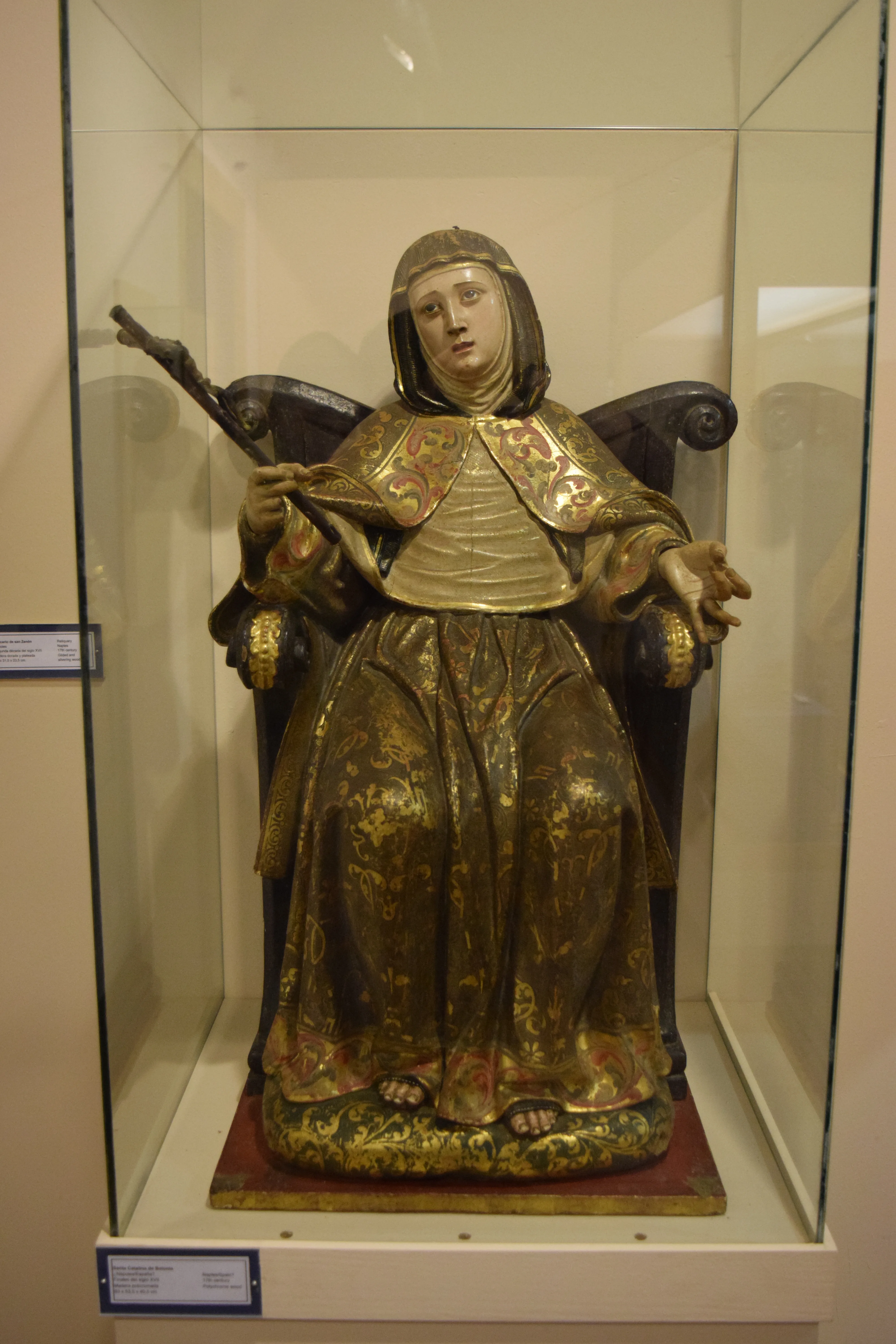Esta escultura sedente representa a Santa Catalina de Bolonia de cuerpo entero, sentada sobre un sillón de madera rematado en volutas en sus extremos. En su mano derecha sostiene un crucifijo, mientras que en la izquierda parece sujetar un objeto hoy desaparecido, probablemente un rosario.
