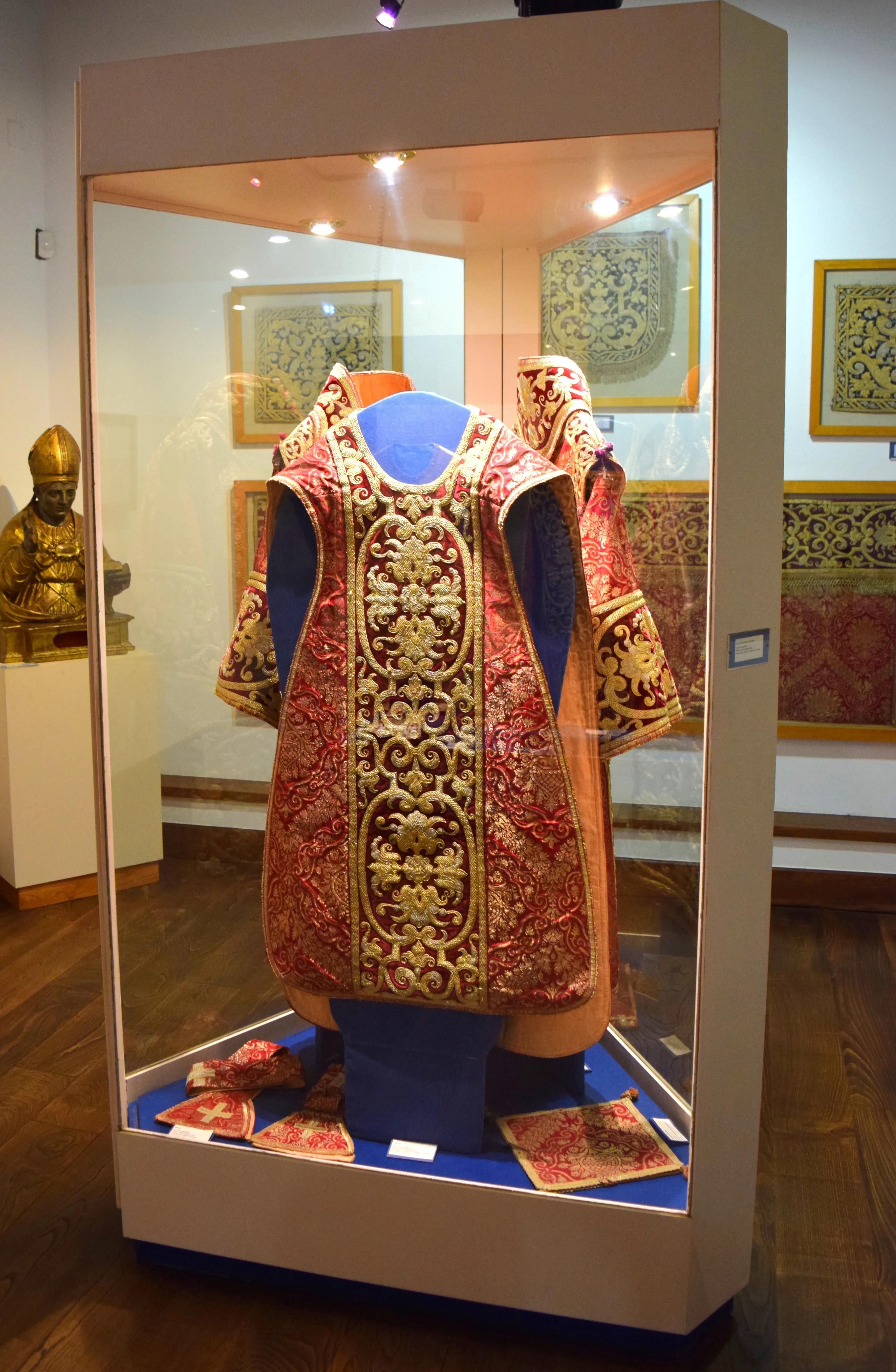 Casulla que forma parte integrante del conocido como Terno de Nápoles. De autoría desconocida, esta prenda litúrgica está realizada a partir de un cuerpo textil de seda roja, con un trabajo de brocado en hilo dorado que muestra cierta inspiración orientalizante. En la franja intermedia se encuentra la parte más elaborada. Allí, sobre una base de terciopelo rojo, un rico bordado en hilos de oro y plata representa motivos de rosetas y hojas vegetales.